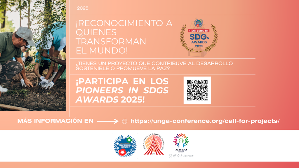 La Journalists and Writers Foundation, junto a sus 52 organizaciones colaboradoras en 27 países —entre las que se encuentra Arco Forum – lanza una nueva edición de los Pioneers in SDGs Awards 2025, para premiar a personas y entidades que están marcando la diferencia en sus comunidades mediante acciones alineadas con los Objetivos de Desarrollo Sostenible (ODS) de United Nations.